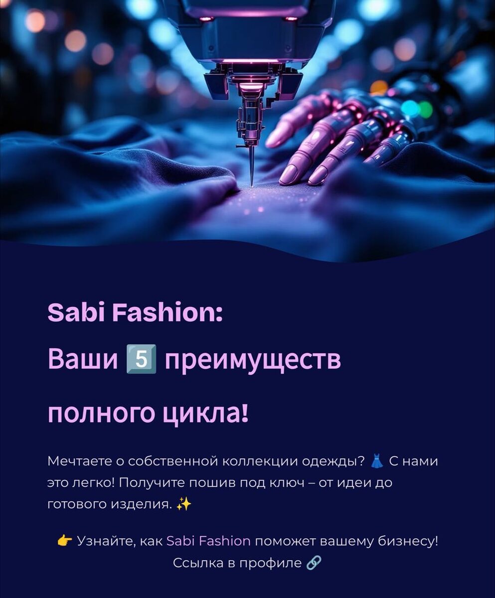 Sabi Fashion — контрактного швейного производства полного цикла, которое с 2012 года успешно работает на рынке создания женской одежды для брендов, ритейлеров и маркетплейсов. Наше производство расположено в Бишкеке (Киргизия), и мы специализируемся на пошиве одежды второго слоя: платья, блузки, юбки, брюки, пиджаки и многое другое . 💡 Свяжитесь с нами для обсуждения вашего проекта: · Телефон: +996 705 900 300 (WhatsApp, Telegram) · Email: sabi.fashion@mail.ru · Адрес: г. Бишкек, ул. Радищева, д. 35, Кыргызстан · Сайт: www.sabi.fashion Мы будем рады стать вашим надежным партнером в создании качественной и модной одежды, которая будет радовать ваших клиентов!