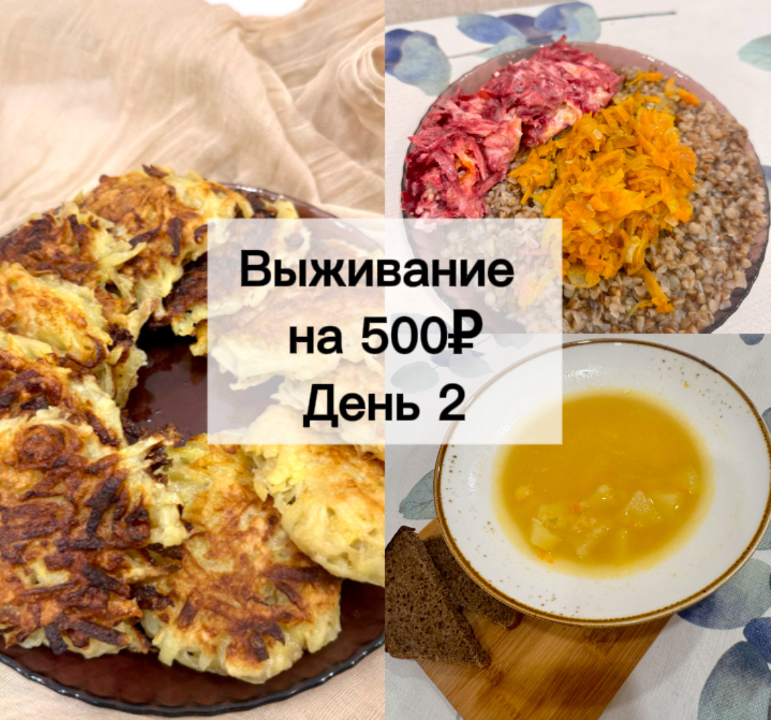 Все привет! 🤗 Мы снова делимся нашим маленьким экспериментом. Всего 35,7₽ в день на человека , где мы пробуем доказать, что даже на такой скромный бюджет можно питаться если спланировать закупку и придумать, что готовить! * Если вдруг того требует ситуация. Второй день позади, и пока нам не кажется, что это трудно. Первые дни всегда проходят легко - силы ещё есть, продукты только начаты. Да, в этот раз у нас меню без мяса. Конечно, хочется котлетку или кусочек курицы, но пока думаем: ну и ладно, справимся и так. 🍽️ Меню второго дня. Завтрак 🌼 У нас были драники - одно из самых любимых и бюджетных блюд. Всё просто: картофель, яйцо, мука, соль. Натёрла картошку, отжала, добавила яйцо и муку до густоты теста. Получается намного сытнее, чем если бы была только картошка. Сейчас кто-то обязательно напишет, что … это разве порция на двоих? Да мой муж таких 10 тарелок один за завтраком съедает… Отвечаю: у нас 500₽ на неделю, что бы не оголодать, этого достаточно. А суть именно такая.