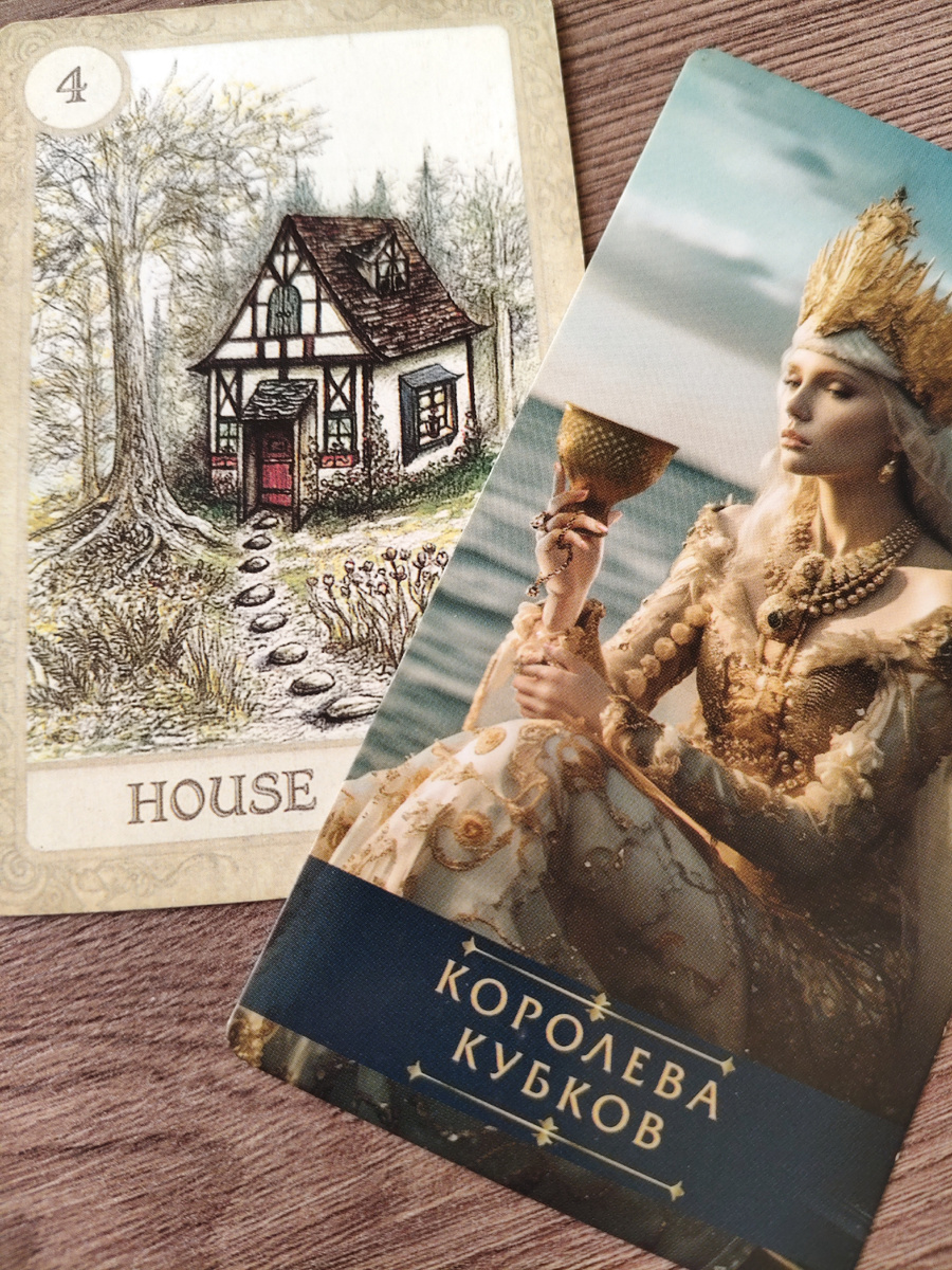 Дом в Ленорман и Королева Кубков в Таро: уют, эмоциональная безопасность и потребность в гармонии. Сочетание указывает на важность домашнего очага, комфорта и поддержки близких. Королева Кубков усиливает интуицию, эмпатию и потребность в эмоциональной защищенности в стенах дома.