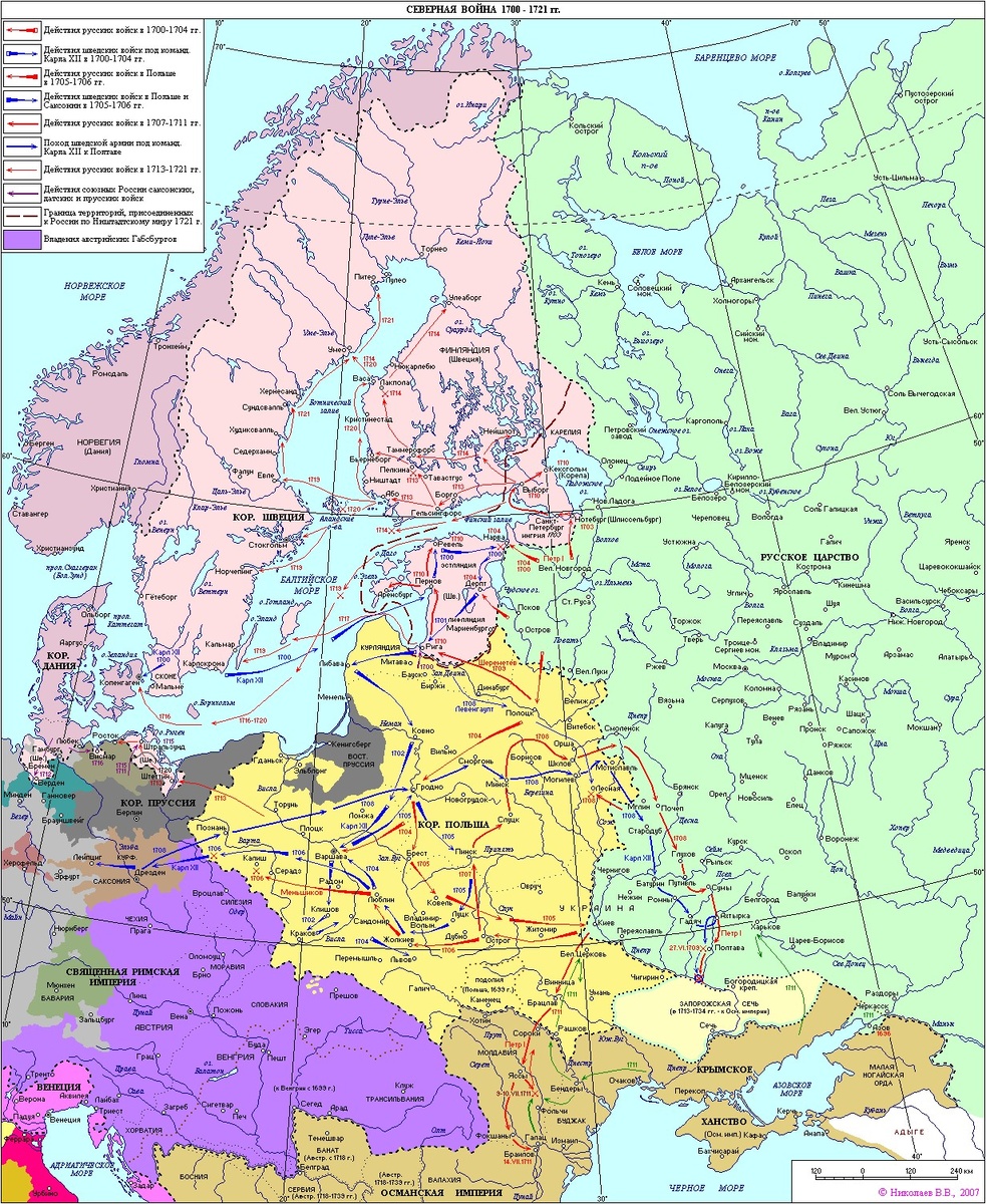 Великая Северная война (свейская война) 1700-1721 гг стала одним из крупнейших конфликтов XVIII века . Она вывела Россию в число великих держав и похоронила имперские амбиции Швеции. Однако, в нашей коллективной памяти эта война занимает не много места и многие моменты остаются не совсем понятны большинству интересующихся. Характер войны Была ли это Русско-Шведская война, или война коалиций? Пётр не решился бы в одиночку противостоять такой мощной державе как Швеция той эпохи. Предварительно русская дипломатия сформировала военный союз, в который помимо России вошло Датско-Норвежское королевство и Саксония, курфюрст которой Август II одновременно был королём Речи Посполитой. Таким образом Швецию удалось окружить кольцом врагов. Опосредованно антишведскую коалицию поддерживала Англия. Швеция же, хоть и не имела прямых военных союзников, но пользовалась поддержкой Франции, Пруссии и Османской империи. Нарвская битва Причины печального исхода битвы при Нарве 1700 г, с которой для России н