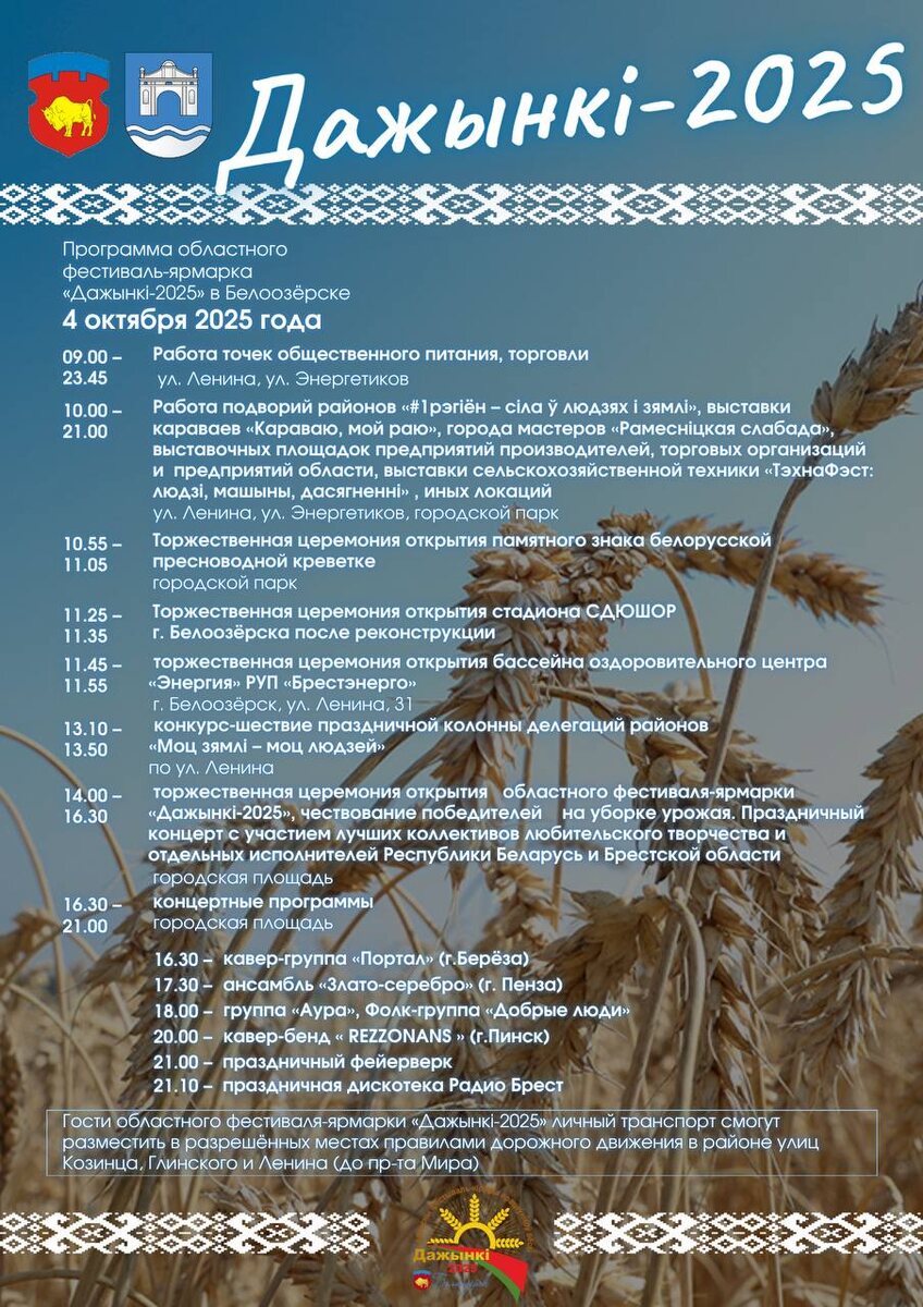 В ответ на пост "Дажынкі"-2025 в Белоозерске! 🌾 4 октября город энергетиков превратится в настоящую праздничный центр #1региона! Здесь будет всё: запах свежеиспечённых караваев, музыка и танцы до полуночи, весёлые подворья, яркие концерты и душевная атмосфера✨ Вас ждёт👇 👉километровые торговые ряды и дегустации от лучших производителей области; 👉ремесленная слобода и выставка сельхозтехники «ТэхнаФэст»; 👉шествие делегаций районов и чествование тружеников села; 👉торжественное открытие новых объектов города — стадиона, бассейна и памятного знака необычному символу Белоозерска — белорусской креветке; 👉большой праздничный концерт с артистами Беларуси и России; 👉фейерверк и дискотека под открытым небом! Белоозерск уже ждёт гостей — обновлённые улицы, тематические соломенные композиции, цветущие клумбы и радушие хозяев праздника создадут неповторимую атмосферу. 🗓4 октября 📍Белоозерск, Березовский район Приходите всей семьёй — это будет день ярких впечатлений, вкусных открытий