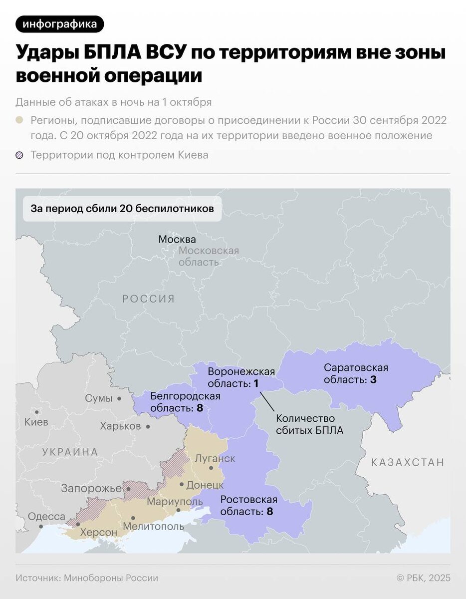 Атаки украинских дронов на российские регионы в ночь на 1 октября — в инфографике.