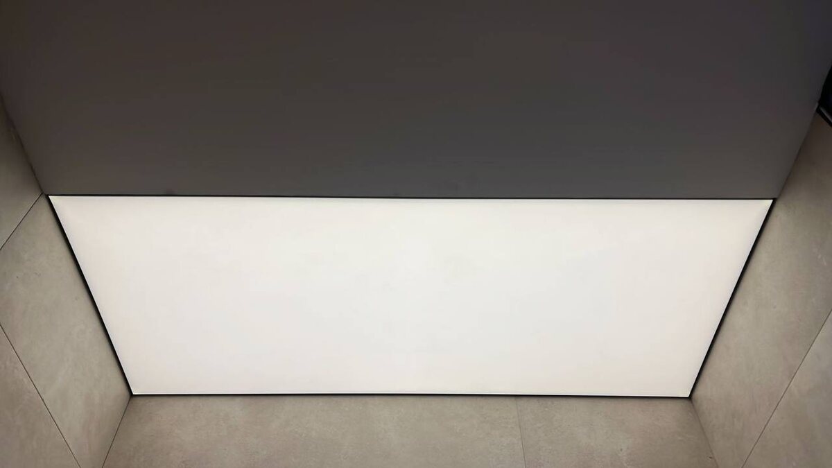 В качестве эксперимента сделали натяжной светящийся потолок в нише над ванной вместо обычных светильников