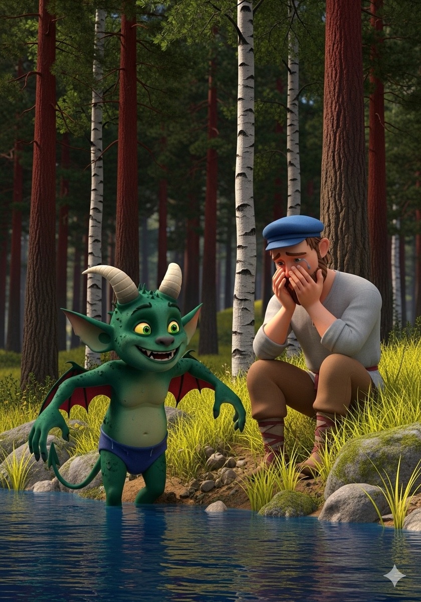 Однажды пошёл мужик в лес дрова рубить. Подошёл к озеру, сел на берег и нечаянно уронил топор в воду. Сидит он и плачет. Вдруг из воды выходит чёрт и спрашивает: — Чего, мужик, плачешь? — Топор, батюшка, утопил. Ушёл чёрт в воду и через недолгое время приносит мужику серебряный топор и спрашивает: — Твой топор? — Нет, — отвечает мужик, — не мой... Чёрт снова ушёл в воду. И снова приносит ему топор, теперь — золотой — и спрашивает: — Твой топор? — Нет, — отвечает мужик, — не мой... В третий раз чёрт вынес мужику его собственный топор, и спрашивает: — Твой топор? — Мой, мой! Тогда чёрт подарил мужику все три топора. И пошёл мужик домой с радостью. Пришёл он домой и рассказал всё мужикам. Тогда одному богатому мужику тоже захотелось получить золотой и серебряный топоры. Пришёл он к озеру, бросил свой топор в воду, сидит и горюет. Выходит из воды чёрт, спрашивает: — Что ты горюешь? — Да в воду топор потопил. Ушёл чёрт. Через недолгое время приносит ему серебряный топор и спрашивает: