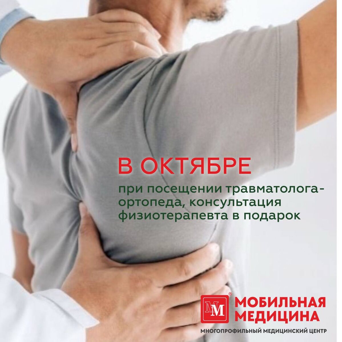 С 1 по 31 октября в клинике «Мобильная медицина» при первичном посещении травматолога-ортопеда консультация физиотерапевта - бесплатно
