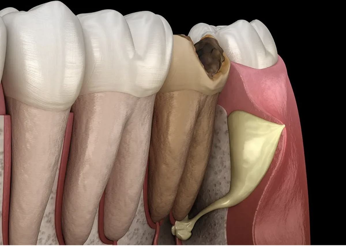 Свищ (фистула) — канал соединяющий очаг воспаления внутри у верхушки зуба с полостью рта, куда вырывается гной. Выглядит как прыщик или шишка светлого цвета, беспокоит при надавливании. С выходом гноя уменьшается в размере и перестаёт болеть. Выздоровление возможно только после удаления первопричины.