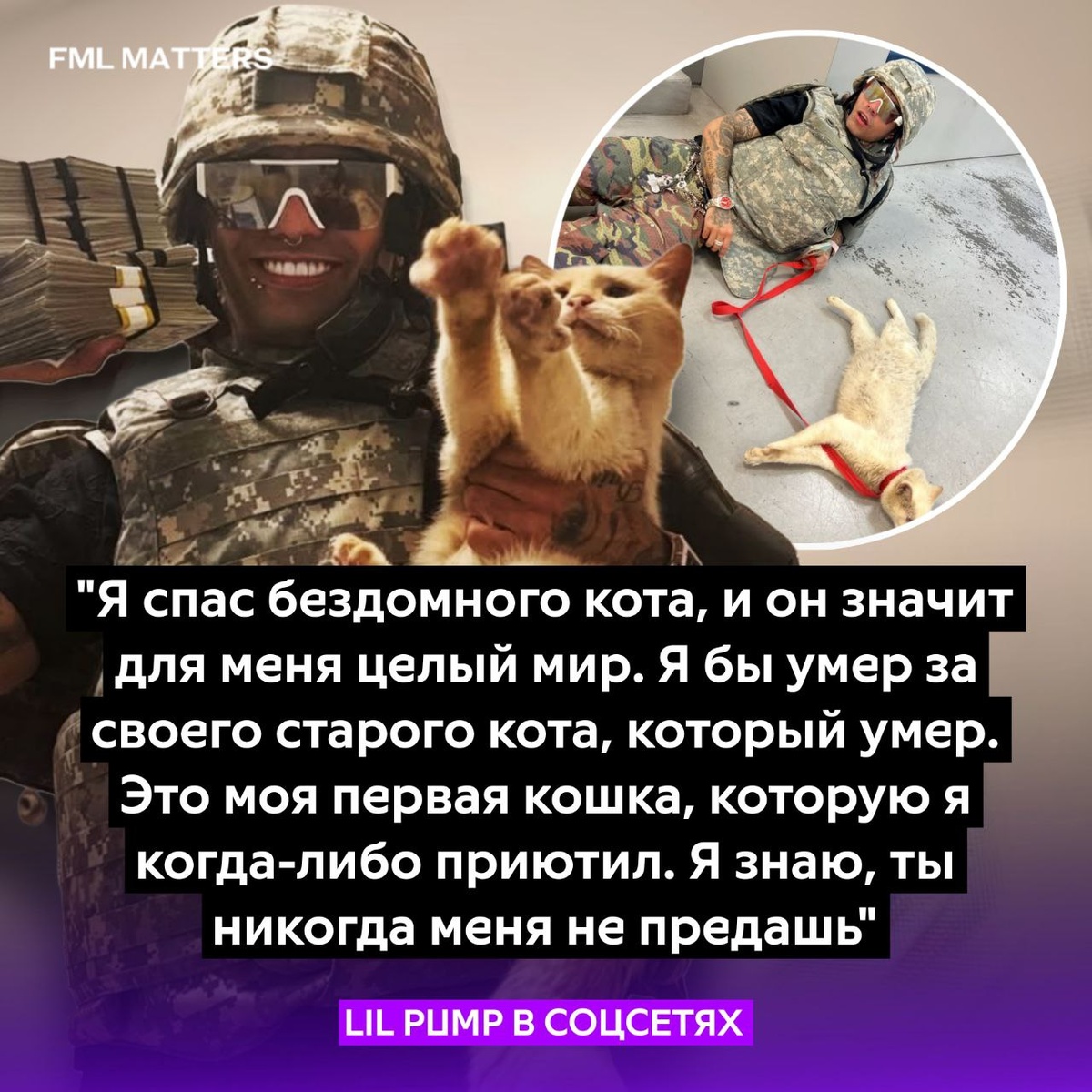 ❤️ LIL PUMP СПАС БЕЗДОМНОГО КОТА! Рэпер приютил бездомного кота — это его первый опыт усыновления. Он признался, что новый питомец уже стал для него очень дорогим, а прежний кот который погиб, он сильно за ним скучает. После отметил, что надеется на верность своего нового друга Респект ❤️🔥 💀 FML MATTERS