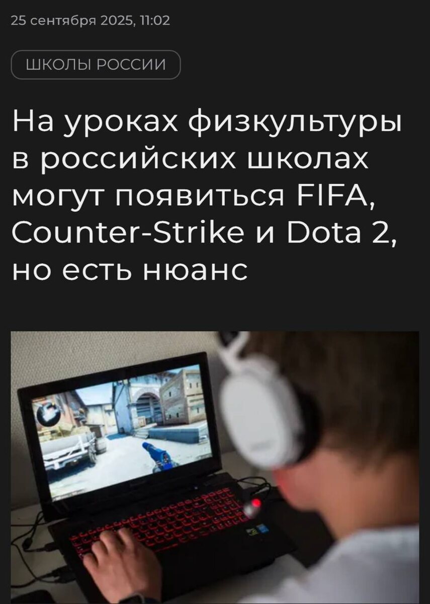 В школьной программе появятся FIFA, CS и Dota 2 — киберспорт засчитают за физ-ру Минпросвещения уже одобрило учебный модуль от 8 до 36 часов, где катки будут считаться тренировкой для реакции и мозга. Идею отправили в Госдуму, так что скоро школьники смогут легально играть на уроках. Но не обольщайтесь: подтягивания и бег всё равно останутся. Так что путь к пятёрке по физ-ре будет выглядеть так — сначала затащил катку, потом пробежал кросс. 🧠TechObserve