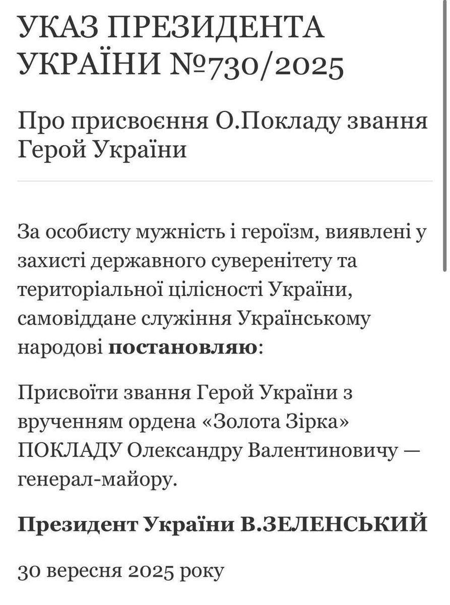 Zelensky continues to promote SBU Major General Poklada, who has now been awarded the title Hero of Ukraine.