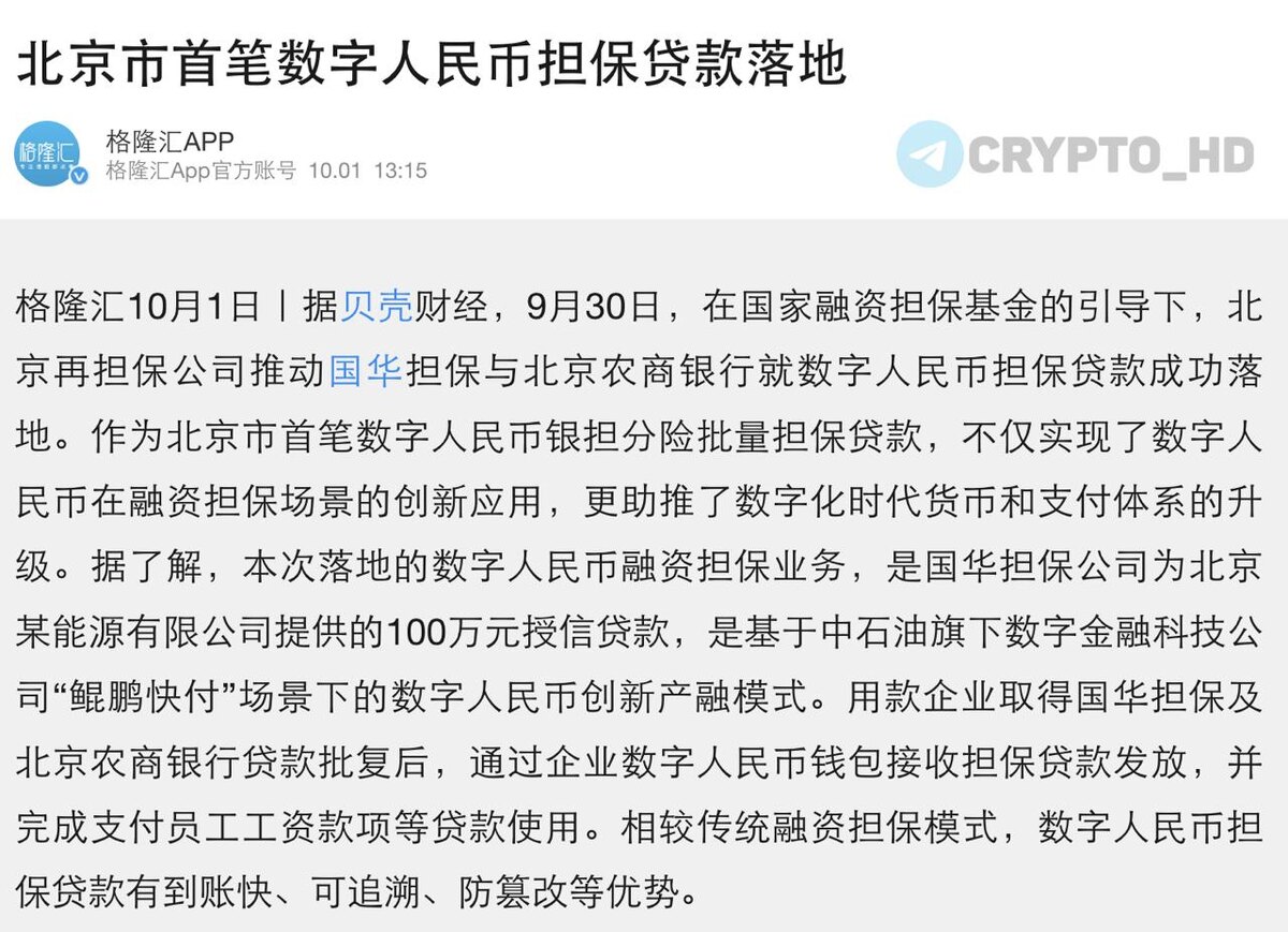 #cbdc 🇨🇳 В Пекине выдан первый кредит в цифровых юанях. ➥ В Beijing Rural Commercial Bank оформили первый кредит на 1,000,000 цифровых юаней. ➥ Формат – госпрограмма, где часть рисков по кредиту берет на себя государство. Это снижает нагрузку на банки и стимулирует бизнес использовать цифровой юань. ➥ Пилотный проект направлен на поддержку малого и среднего бизнеса: компания получает деньги быстрее и с господдержкой, а власти продвигают массовое применение e-CNY. Ранее: цифровой мост Crypto Headlines