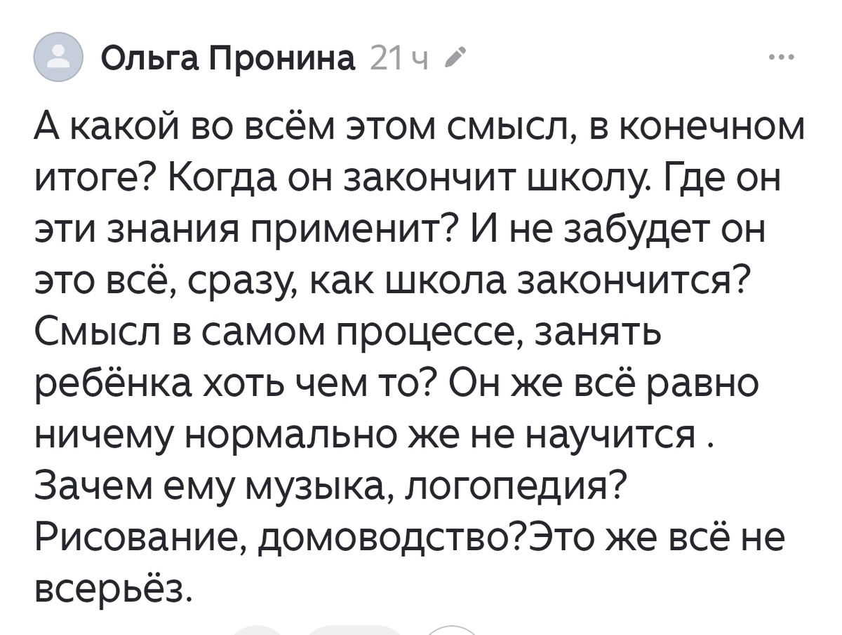 Слепила заголовок из двух комментариев, причём один стырила с дружественного канала (простите, Мила 😁), а второй получила самолично. Собственно каналы и статьи были посвящены обучению слепых детей с умственной отсталостью в коррекционных школах. Комментаторы разные, что заставляет улыбнуться два раза. Так вот, на осеннее обострение психического состояния людей, считающих себя здоровыми, хочется ответить. Когда родители детей с ментальной и другой инвалидностью решают отправить отпрысков в школу, они руководствуются фактически тем же, чем и остальные родители. Во-первых, у нас в стране по закону "Об образовании" необучаемых детей нет. Родитель, который вовремя не определил дитя в школу, нарушает конституционные права человека и может быть привлечён к ответственности. В переводе на человеческий: чтобы не задалбывали опека, школа, полиция и другие ответственные люди. Во-вторых, родители детей с инвалидностью хотят, чтобы дети максимально развивались. И обучались. Может быть, для ког