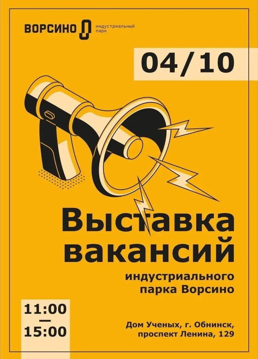 4 октября – выставка вакансий Индустриального парка «Ворсино» 4 октября Индустриальный парк «Ворсино» проведёт в Обнинске выставку вакансий. Участникам выставки будет представлены вакансии от лидеров региона: Рефкул, Грайф Россия, ОРАК, Натюрель, Фаворит Трейд, АстраЗенека Индастриз, Премо Инк Восток и другие. Выставка вакансий – это: - прямое общение с представителями работодателя - полная информация об открытых вакансиях на предприятиях, уровне зарплаты и условиях труда - отличный шанс получить контакты работодателя и оставить свое резюме - возможность узнать о деятельности самого крупного индустриального парка Калужской области Рассматриваются соискатели с разным уровнем образования и опытом работы. Соискателей ждут с 11:00 до 15:00 в Доме учёных (пр. Ленина, 129).