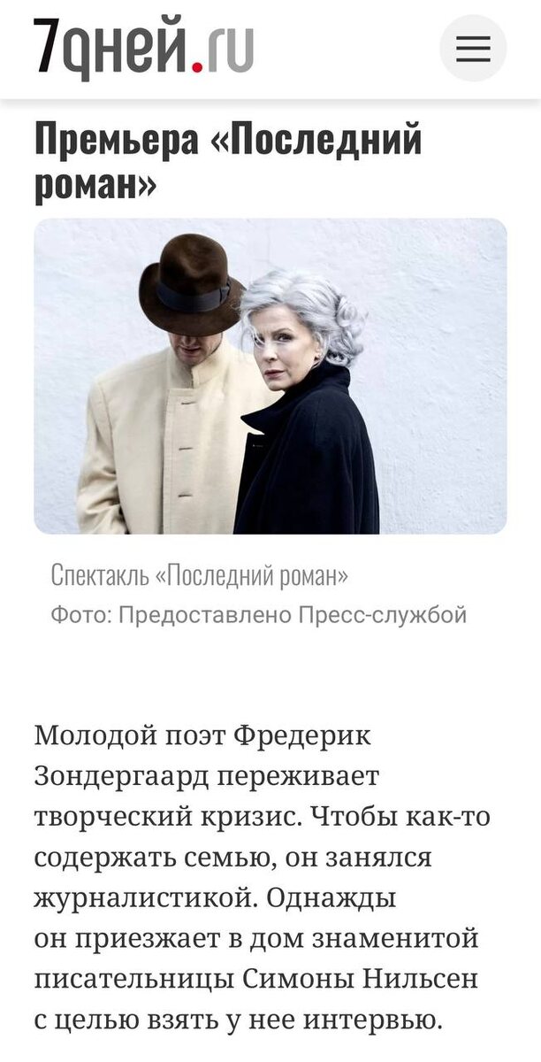 «Только самые сильные впечатления от московских театров этой осенью», - издание «7 дней» традиционно делает подборку спектаклей, на которые стоит обратить внимание. Среди них - «Последний роман» 10, 19 октября, 16, 30 ноября Материал доступен по ссылке