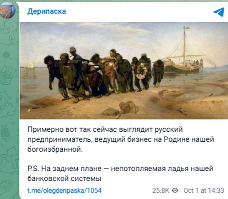 Дерипаска сравнил российских предпринимателей с бурлаками на Волге: «На Родине нашей богоизбранной» Миллиардер Олег Дерипаска опубликовал картину «Бурлаки на Волге» Ильи Репина в своём телеграм-канале. Он сопроводил её такой подписью: «Примерно вот так сейчас выглядит русский предприниматель, ведущий бизнес на Родине нашей богоизбранной. P.S. На заднем плане — непотопляемая ладья нашей банковской системы». На днях стало известно, что федеральные власти хотят повысить налог на добавленную стоимость (НДС) с 20% до 22%. В 2018-м НДС уже повышали с 18% до 20%. При этом ещё в 2024 году президент РФ Владимир Путин выпускал поручение Федеральному Собранию «зафиксировать основные параметры налоговой системы» до 2030 года, а в июне 2025 года министр финансов страны Антон Силуанов уверял, что налоги меняться не будут, несмотря на то, что российский бюджет «штормит». Подписаться| Прислать новость| Помочь бустами