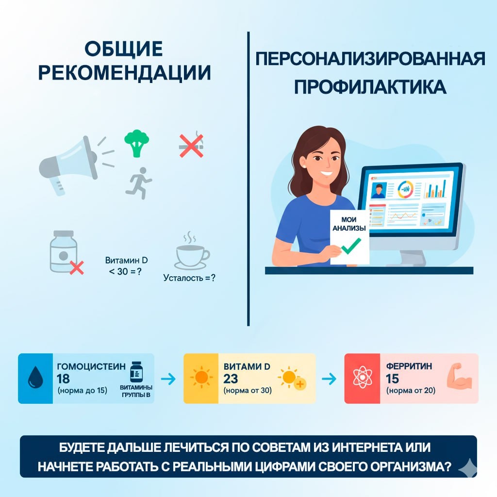 Все эти "правильно питайтесь, занимайтесь спортом, не курите" – это демагогия для масс. А что конкретно нужно именно ВАМ? - Ваш гомоцистеин 18 при норме до 15 – нужны витамины группы В, а не общие поливитамины - Ваш витамин D 23 при норме от 30 – риск депрессии, остеопороза и снижения иммунитета - Ваш ферритин 15 при норме от 20 – объясняет хроническую усталость лучше любых энергетиков Персонализированная профилактика работает в 7 раз эффективнее общих рекомендаций.