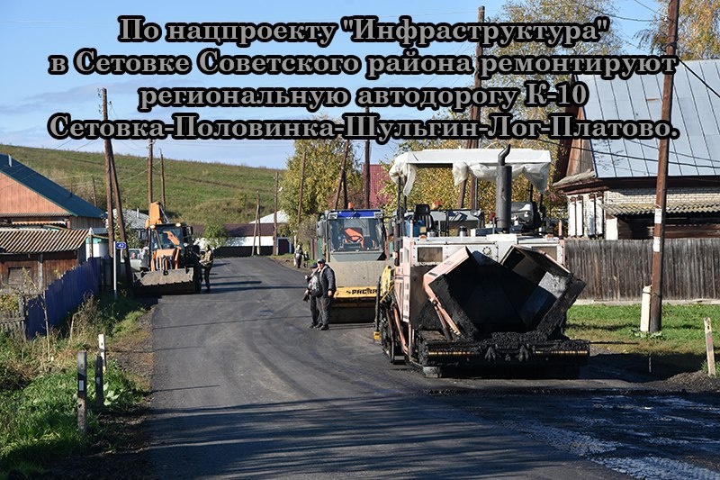Безопасность – превыше всего: в Советском районе ремонтируют дороги по нацпроектам В Советском районе по национальным проектам «Безопасные качественные дороги» и «Инфраструктура» обновили участки автомобильных дорог в сторону Бийска и Урожайного и ремонтируют дорогу в Сетовке. Работы ведут работники ГУП ДХ Алтайского края «Юго-восточное ДСУ» филиала «Советский».По нацпроекту «Инфраструктура» в селе Сетовка (улица Советская) две недели назад начали ремонт участка региональной автодороги К-10 Сетовка – Половинка – Шульгин Лог – Платово – граница Республики Алтай, рассказал начальник ГУП ДХ Алтайского края «Юго-восточное ДСУ» филиала «Советский» Александр Коровин. В рамках проекта там сделают новое двухслойное асфальтобетонное покрытие на участке протяженностью 4,266 км (от въезда и до выезда из села с 4 по 8 км) и обустроят тротуар протяженностью 3,977 км.Первый слой асфальта в обе стороны уже уложен от мос... Ссылка на публикацию #СоветскийРайон