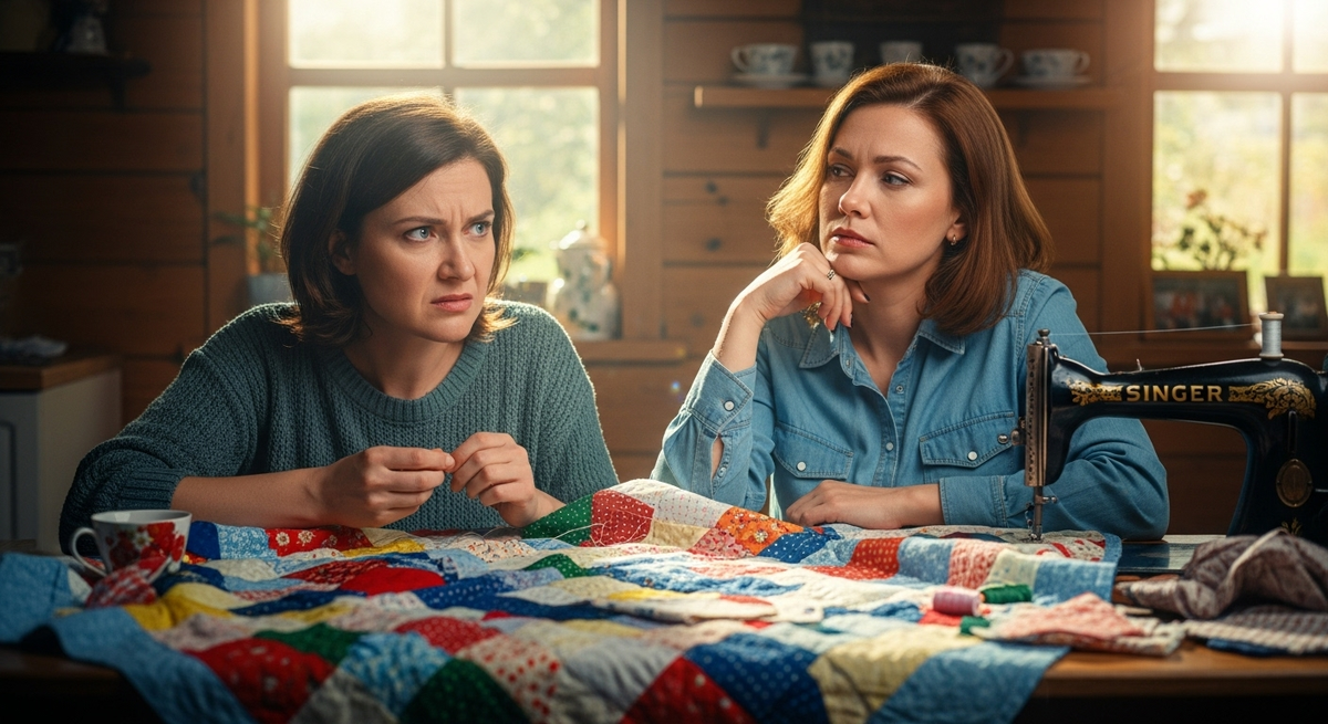 — У меня есть идея для последнего лоскутка, — сказала она сквозь слёзы. — Помнишь, у мамы есть старая скатерть, которую она сама вышивала? С васильками. Мы всегда стелили её на стол, когда собирались всей семьёй на праздники.