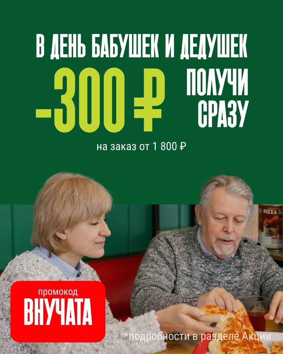 ✨🎉 Внимание, внучата! Сегодня отличный повод порадовать самых дорогих людей – бабушек и дедушек! ❤️ Дарим скидку 300 ₽ на заказ от 1800 ₽ в честь Дня бабушек и дедушек. Пора собраться всей семьёй за вкусной пиццей и подарить своим родным ещё один повод для улыбки! 🍕😊 👉 Просто вводи промокод ВНУЧАТА и получай скидку сразу Не упусти шанс сделать этот день по-настоящему тёплым и вкусным! 🌟 #ДеньБабушекИДедушек #Семья #Скидка #Пицца