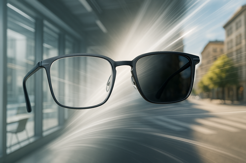 Представьте, что ваши очки подстраиваются под солнце так же естественно, как зрачки — это и есть магия фотохромных линз. Внутри их, казалось бы, обычной прозрачности скрываются фотоактивные молекулы, готовые мгновенно реагировать на ультрафиолет (УФ). Разберёмся, как устроен этот высокотехнологичный «хамелеон» и чем современные фотохромы отличаются от своих предшественников. Основу фотохромного эффекта составляют соединения класса спирооксазинов и нафтопиранов (в полимерных линзах) либо кристаллы галогенидов серебра (в минерале). Под действием УФ-кванта кольцевая структура молекулы размыкается, смещая её спектральную полосу поглощения в видимую область. Оптическая плотность (OD) растёт, линза темнеет. Как только поток УФ падает ниже пороговой мощности, начинается реверсивная реакция — молекула возвращается в исходное состояние, прозрачность восстанавливается. Скорость активации (fade-in) — время набора 80 % максимальной оптической плотности, обычно 15-35 с. Скорость дезактивации (fade-