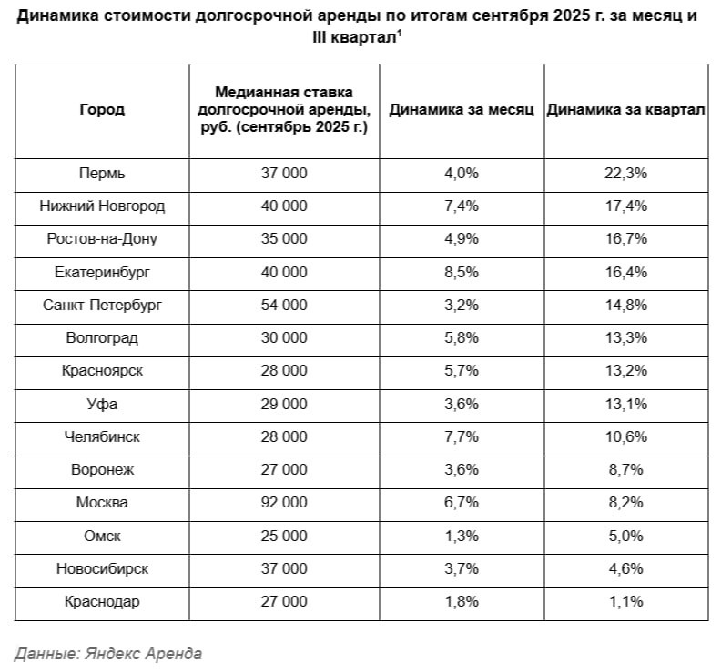 На III квартал 2025 года число сдаваемых квартир в Москве сократилось на 29,8%. Медианная ставка долгосрочной аренды по всем типам квартир в сентябре достигла 92 000 ₽, что на 8,2% выше квартального показателя. • Студии и 1‑комнатные: 75 000 ₽ • 2‑комнатные: 102 000 ₽ • 3‑комнатные: 154 000 ₽ Причина роста — сокращение предложения, особенно бюджетных лотов. Средняя площадь сдаваемых квартир выросла за месяц на 6,4% до 48,9 м².