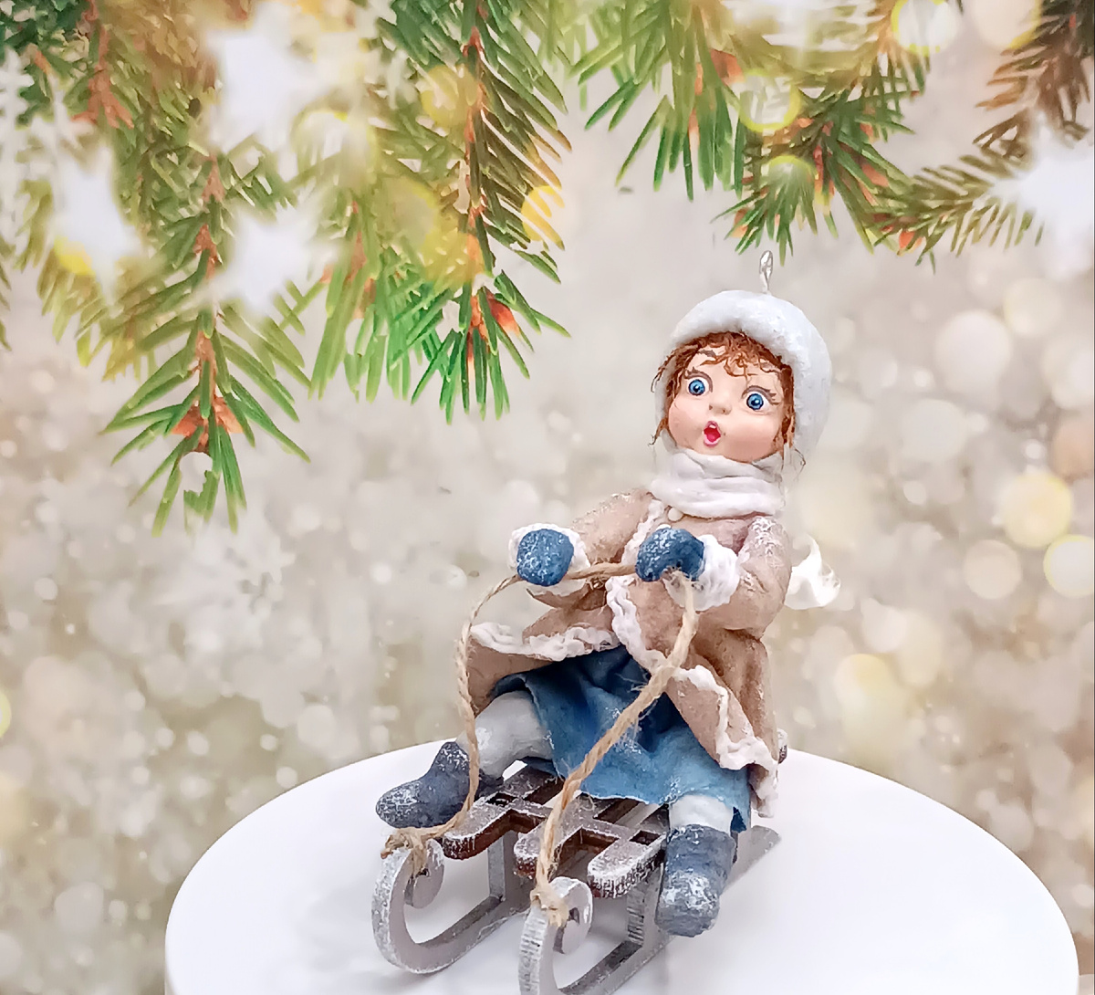 Ватная игрушка на санках. Одеваем девочку в юбку и пальтишко