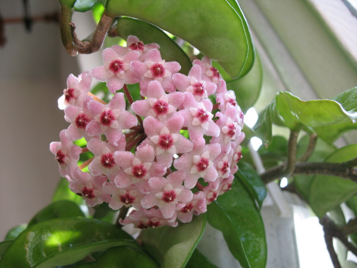 Самая популярная Hoya carnosa (хойя мясистая) - отличается толстыми зелеными листьями и ароматными цветами, собранными в плотные соцветия. Есть пестролистные формы с белыми или розоватыми пятнами. Один из эффектных сортов этой группы - Hoya carnosa "Compacta" , или "индийская веревка", с закрученными плотными листьями и необычным внешним видом.