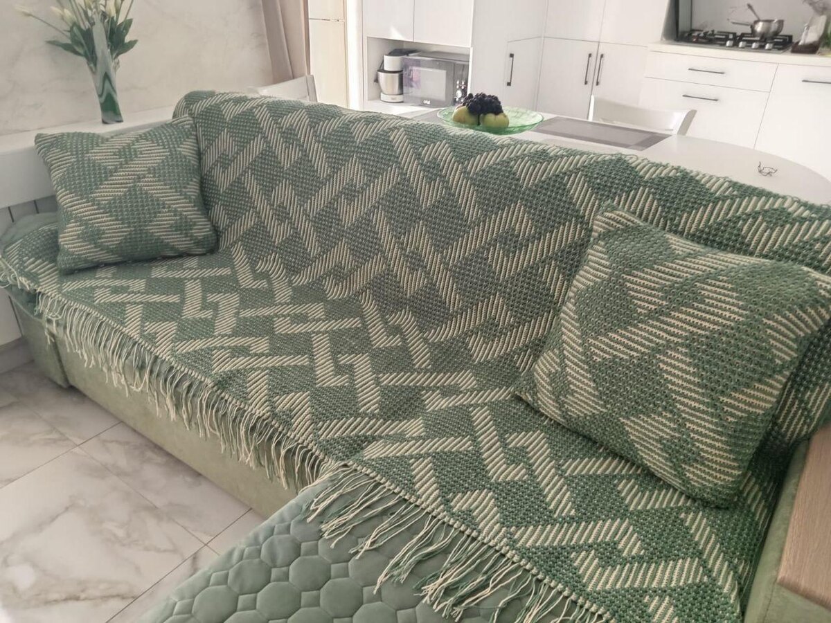 Анна: «Готова интерьерная коллекция " Араны", плед размер 120*200( пожелание заказчика), подушки 50*50, пряжа Alize baby best, цвет зелёный и молочный, крючок #4.5 .