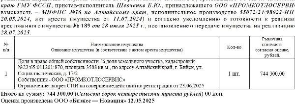 Название: Лот№1 Доля в праве общей собственности. ¼ доля земельного участка, кадастровый №22:65:011201:870, площадь 3588 кв.м., по адресу Алтайский край, г. Бийск, ул. Социалистическая, д. 17/2. Нач.цена 744300 руб. (ООО «ПРОМКОТЛОСЕРВИС», запрет СПИ на совершение действий по регистрации от 23.06.2025) (189) Канал: Госземля Алтайский край Область: край Алтайский Алтайский край Район: г. Бийск Населенный пункт: ул. Социалистическая, д. 17/2. Локация: Смотреть на карте ВРИ: Земельные участки общего назначения Кадастровый номер: 22:65:011201:870 Кадастровая стоимость: 1805122.80 Вид сделки: Продажа Площадь: 3588 м² Начальная цена: 744300.00 руб. Дата завершения: 29.10.2025 Подробнее: ГИС ТОРГИ #госземля #земляотгосударства #земля #земельныйучасток #земельныеторги #торги #аукцион #продажаземли #продажа #алтайскийкрай