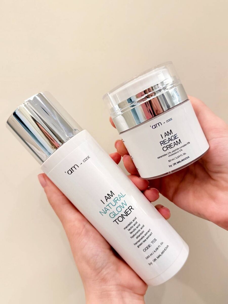 КОМПЛЕКСНЫЙ УХОД ДЛЯ МОЛОДОСТИ ВАШЕЙ КОЖИ Представляет идеальный тандем для преображения кожи. ✨ I AM RE:AGE TONER — РЕВОЛЮЦИЯ В ТОНИЗИРОВАНИИ ✨ Этот многофункциональный тоник не просто освежает, а запускает процессы глубокого обновления: • Мгновенно устраняет отечность и следы усталости • Повышает проницаемость кожи для активных компонентов • Интенсивно увлажняет и укрепляет дерму • Стимулирует выработку коллагена для упругости • Блокирует транспорт меланина, предотвращая пигментацию • Нормализует работу сальных желез • Укрепляет капилляры, уменьшая покраснения Применение: наносите дважды в день на очищенную кожу лица и шеи руками или ватным диском. Подходит для области вокруг глаз. Для усиленного эффекта комбинируйте с I am Natural glow toner. ✨ ОМОЛАЖИВАЮЩИЙ КРЕМ С ЦЕРАМИДАМИ И ПЕПТИДАМИ ✨ Роскошный anti-age крем для всех типов кожи, особенно для сухой, чувствительной и обезвоженной. Идеален с 35 лет: • Восстанавливает гидролипидную мантию кожи • Обеспечивает мощный омолаживаю