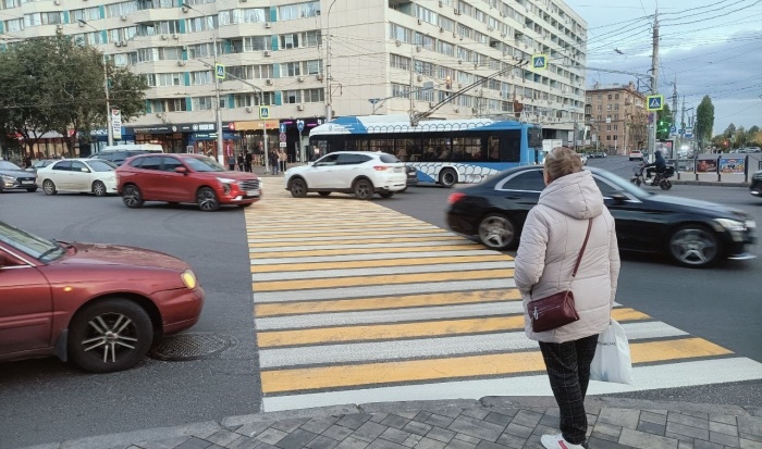 Необычная диагональная зебра появилась в областном центре на перекрестке улицы Краснознаменской и проспекта Ленина.