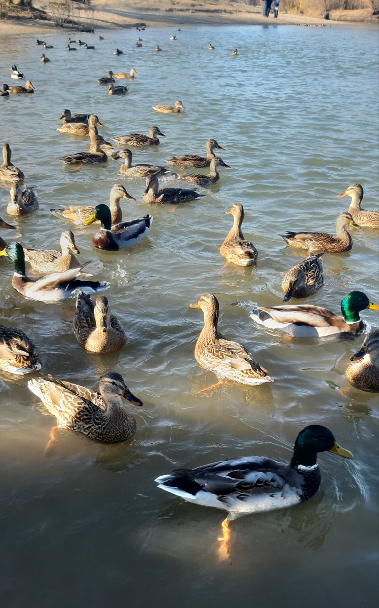 - Зелень! - радостно и громко кричал мальчик от двух до пяти, выбегая на берег реки. - Какая зелень? Это утки! - поправила его следом мама. - Зелень! - настаивал мальчик. - Утки! - не уступала мама. - Зелень! - почти совсем уже вышел из себя мальчик. Пытался объяснить всем телом и всей душой, как взрослые не умеют. И мама вдруг поняла: - Селезень! А там утиный кавалер с головой именно такого цвета, как будто нырнул ей в зелёнку, настойчиво поспешал за неброской изящной утицей. Поспешал по воде, потом засеменил по берегу. Утица сжимала в клюве кусок хлеба, кавалер забегал то справа, то слева. Голова его отливала на солнце изумрудом и малахитом. Твёрдо помня о том, что в природе побеждает сильнейший, утица ещё поднажала. И кавалер сдался. Вернулся в стадо, в коллектив. Густая толпа толклась в воде у самого берега, а некоторые из гуляющих в парке людей сыпали крупу. Всё прибывали селезни, как из под воды вырастали утицы. И даже присоединились к пиршеству, пользуясь случаем, несколько белы
