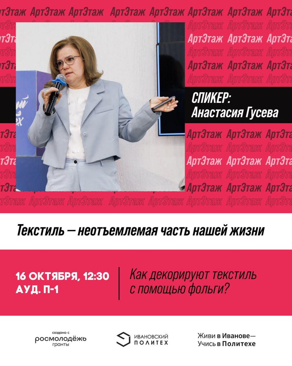 Текстиль — неотъемлемая часть нашей жизни Хотите знать, как декорируют текстиль с помощью фольги? Приходите 16 октября в ауд. П-1 Профессионалитета на мастер-класс от ГК «ДубльВ» (Москва). ⌚️Начало в 12:30 ✏️Регистрация в проекте «Наш АртЭтаж» – на месте Проект «Наш АртЭтаж» реализуется при грантовой поддержке Федерального агентства по делам молодёжи — Росмолодёжь. #РосмолодёжьГранты #Росмолодёжь #Наш_АртЭтаж #ЖививИванове_УчисьвПолитехе