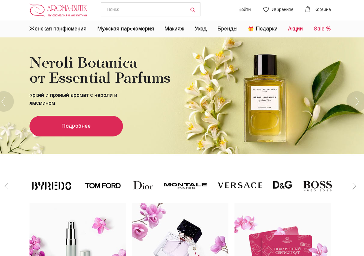 Aroma Butik радует удобным интерфейсом: все удобно организовано и легко найти нужный продукт. Этот интернет-магазин делает ставку на простоту: зачем усложнять, если можно просто и понятно донести все преимущества товара. Оригинальная парфюмерия — их главный козырь.