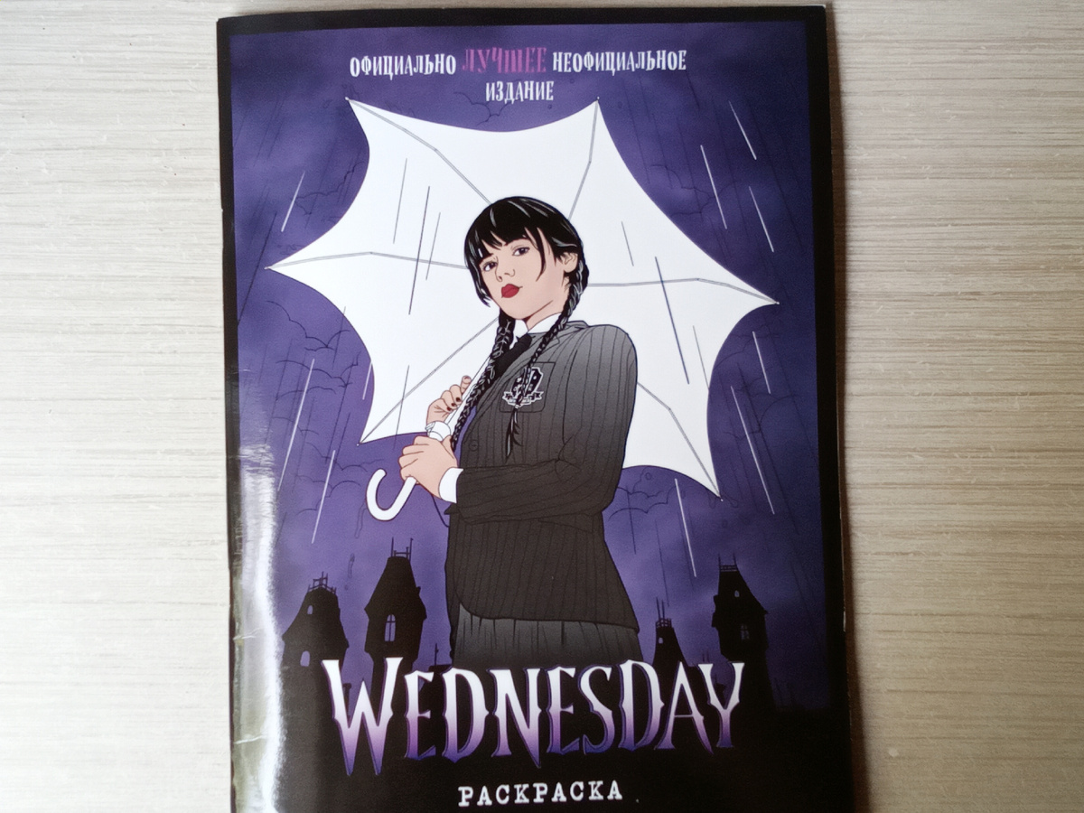Всем чернично-космический привет! Не так давно пересмотрела первый сезон и посмотрела второй сериала "Уэнсдей". Оставшись под сильным впечатлением, решила полистать раскраску Wednesday и обдумать ещё раз, буду ли её вообще красить. Да, я не решила, возьмусь ли за раскрашивание или книга так и будет стоять на полке. А пока буду писать текст, может быть, приму решение. Покупала раскраску весной в Фикс Прайс. Тогда был хороший подвоз раскасок. Ну вы помните. Изначально не планировала брать её в коллекцию, так как на тот момент сам сериал мне понравился не настолько (это сейчас я его оценила на все сто), чтобы покупать раскраску. Но все же решила приобрести. Ведь над сериалом работал мой любимый Тим Бертон. Как видите, на обложке указано, - это неофициальное издание. Картинки, как я поняла, созданы в какой-то компьютерной программе: такое ощущение, что кадры из сериала просто обвели и перенесли на лист. Я в этом не сильно разбираюсь, но впечатление сложилось такое. А вообще, иллюстрац