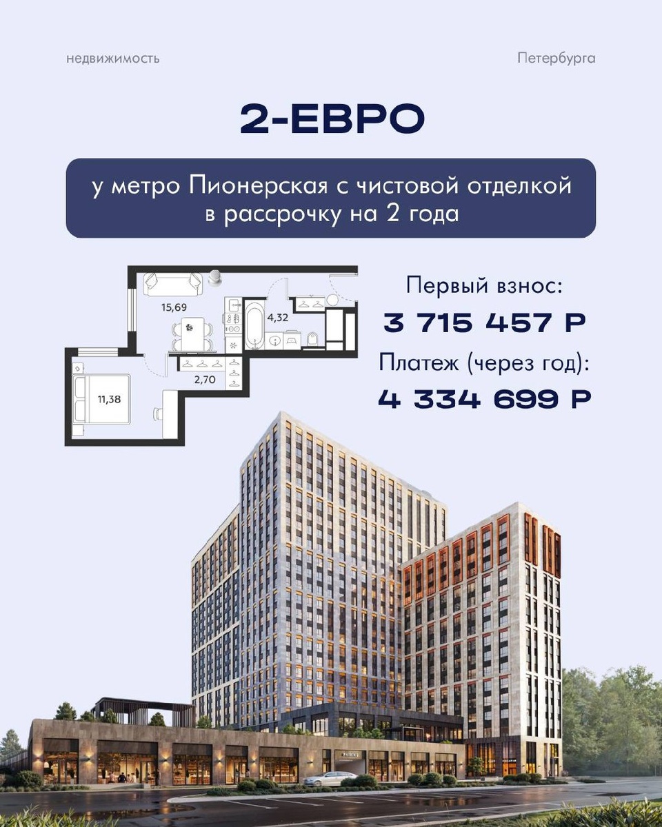 Квартира с отделкой у метро в рассрочку на 2 года Ищете вариант на севере города? В свежем проекте у метро Пионерская есть апартаменты с одной спальней (2Евро), которые можно купить в рассрочку до 2 лет — без семейной ипотеки. ↖️ Пример расчёта на 2 года 2Евро, 34 м², 18 этаж, увеличенные окна, потолки 2,9 метра, вид на город Чистовая отделка под ключ Сдача дома в 1 квартале 2028 года Стоимость со скидкой 12% (при подписании в октябре): 12 384 856 Первый взнос (30%) — 3 715 457 ₽ Второй платёж (35%) через год — 4 334 699 ₽ Остаток (35%) через 2 года — 4 334 699 ₽ 📌 О проекте — Комплекс рядом с Удельным парком и станцией метро Пионерская: удобно для жизни и сдачи в аренду — В комплексе — фитнес, кинотеатр, детский клуб, спа, ресторанная аллея, секретный сад — Управляющая компания уровня 4*, все сервисы по принципу отеля Если нужен индивидуальный расчёт по другим планировкам или условиям оплаты — напишите в личные сообщения.