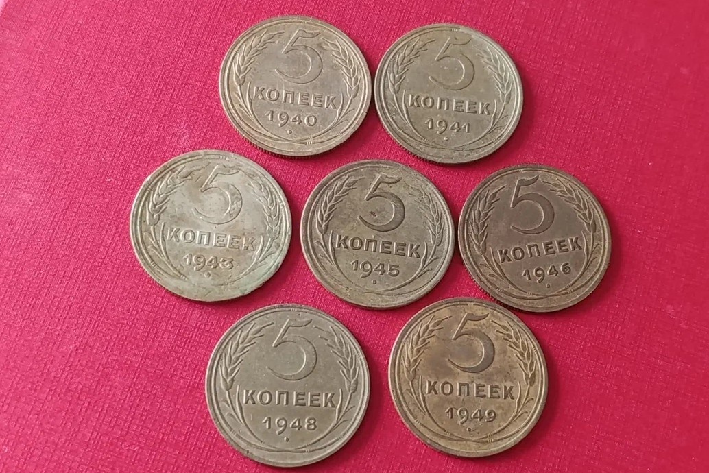 В данной публикации поговорим про советские пятикопеечных монеты 40-х годов. У меня имеются вот такие монетки: Все года - 1940, 1941, 1943, 1945, 1946, 1948, 1949. Во время Великой Отечественной войны оборудование с Ленинградского монетного двора было перенесено в город Краснокамск (ныне Пермский край). Именно поэтому чеканка монет не останавливалась, хотя в монетном ряду отсутствуют некоторые года. Сами по себе монеты 5 копеек 40-х годов нумизматической редкостью не являются. Но ценятся, конечно, экземпляры в очень хорошем состоянии. Из них самая дорогая монета - 5 копеек 1945 года. Оценивается примерно в 2,5-3 тысячи рублей. Самая дешевая монета - 5 копеек 1946 года. Оценивается в 100-150 рублей. Также относительно недорогие и распространенные монеты 1940, 1943, 1948 и 1949 годов. В среднем 200-500 рублей. Монета 5 копеек 1941 года оценивается примерно в 1000 рублей. Данные цены являются лишь отражением встречаемости (пропорции) монет относительно друг друга. Основная цена ск