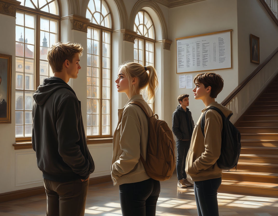 Среди новоявленных студентов был и Артём - высокий парень с русыми волосами и немного застенчивой улыбкой. Он приехал из маленького посёлка, где все знали друг друга, и теперь, в этом огромном здании с высокими потолками, чувствовал себя муравьём в разворошенном муравейнике.