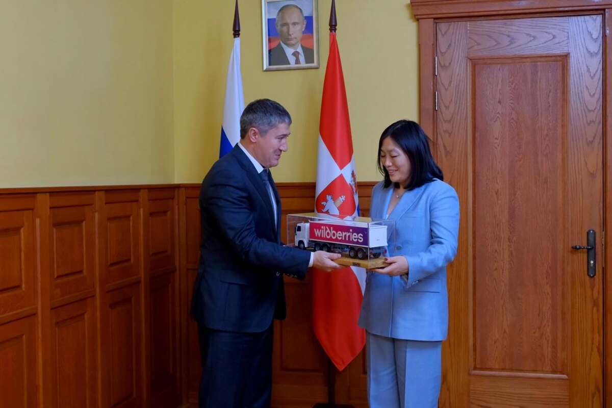 Пермь посетила основательница Wildberries Татьяна Ким. Рабочую встречу с ней провел губернатор Пермского края Дмитрий Махонин. Они обсудили онлайн-торговлю и строительство логистического комплекса. По словам главы региона, за восемь месяцев этого года объем продаж на маркетплейсе вырос на 34 % и превысил 45 млрд рублей. Более 1,2 млн жителей региона совершают покупки онлайн. «Видим и перспективы для сотрудничества с компанией в сфере туризма. На маркетплейсе появляются туристические продукты, мы готовы поддерживать это направление», – сообщил г-н Махонин. Фото: Дмитрий Махонин/ Telegram-канал. 🔴 Подписывайтесь на Business Class | Оставляйте «бусты»