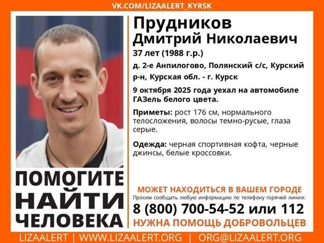 Ориентировку на поиск 37-летнего Дмитрия Прудникова распространили волонтеры отряда "ЛизаАлерт". Уточняется, что мужчина из деревни 2-е Анпилогово Курского района. 9 октября он уехал на "Газели" белого цвета и пропал. На нем были черные кофта и джинсы, белые кроссовки. Тех, кому известна любая информация, просят звонить по номеру 112 или телефону горячей линии 8800705452.