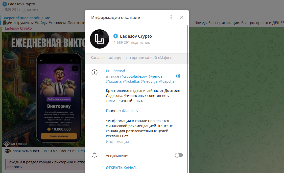 3️⃣ Ladesov Crypto — флагманский телеграм-канал.