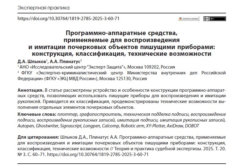 Вышел в свет свежий номер научно-практического журнала «Теория и практика судебной экспертизы» (ФБУ РФЦСЭ имени профессора А.Р. Шляхова при Минюсте России), в котором опубликована статья «Программно-аппаратные средства, применяемые для воспроизведения и имитации почерковых объектов пишущими приборами: конструкция, классификация, технические возможности», подготовленная мною в соавторстве с А.А. Плинатусом. В статье рассмотрены устройство и особенности конструкции программно-аппаратных средств, позволяющих использовать пишущие приборы для воспроизведения и имитации рукописей. Впервые в отечественной литературе приводятся наиболее значимые для почерковедческой и технической экспертизы документов основания для классификации данных приборов, продемонстрированы технические возможности выполнения отдельных элементов почерковых объектов. Информация, изложенная в статье, рекомендована, прежде всего экспертам, представителям научных и образовательных учреждений, работающим в сфере судебно-почер