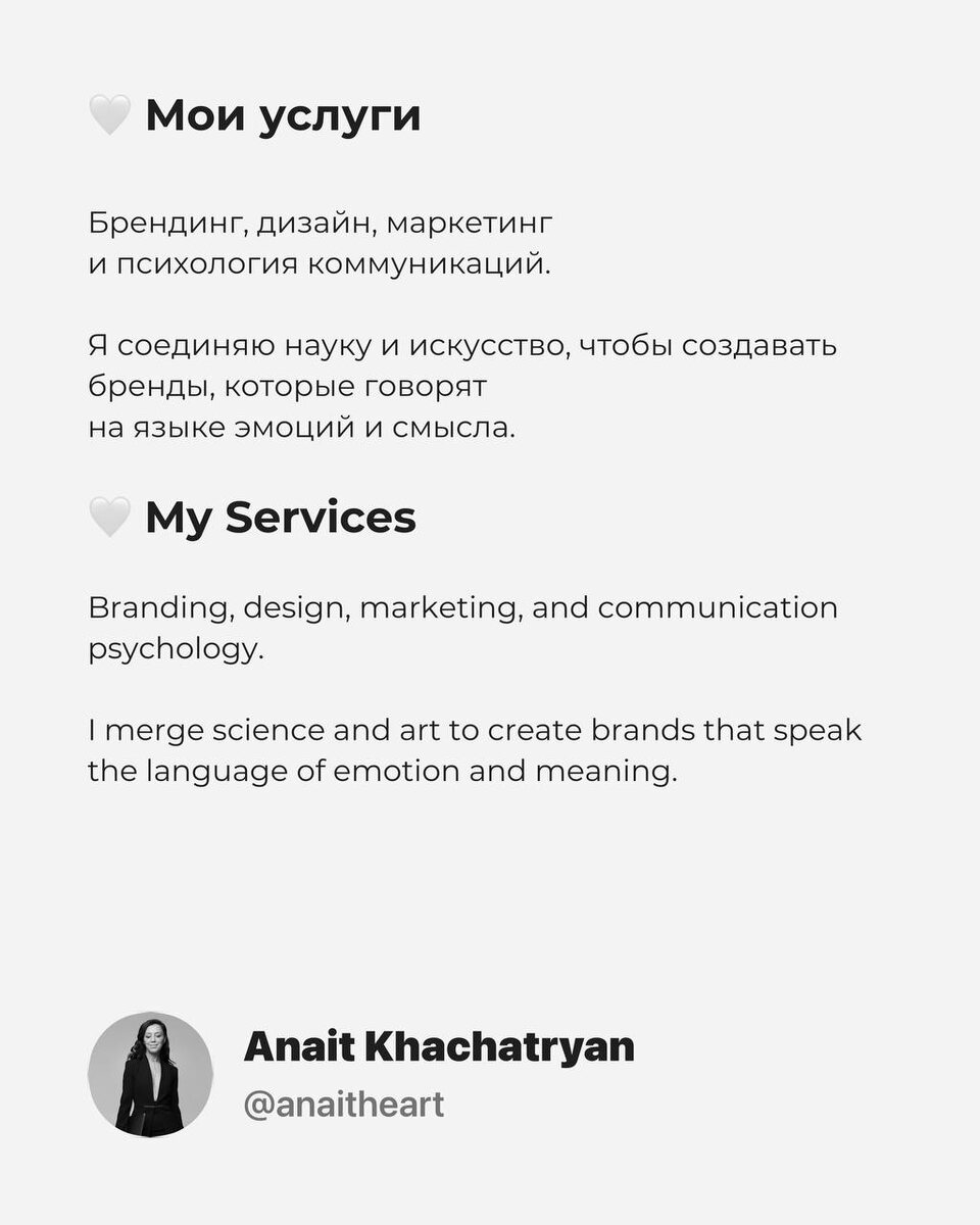 «Новый визуальный код / New Visual Code» Брендинг, дизайн и психология коммуникаций. Там, где встречаются наука и искусство, рождается новый визуальный код. Всё, что я делаю, — о человеке, смысле и визуальном языке. Я соединяю дизайн, маркетинг и психологию коммуникаций, чтобы бренды говорили, чувствовали и вызывали доверие. За 17 лет в сфере дизайна я создала десятки айдентик, упаковок и стратегий, которые помогли бизнесам расти, находить свой голос и создавать эмоциональную связь с аудиторией. Мой подход основан на синтезе науки и искусства. Психология помогает понять, как человек воспринимает форму, цвет и ритм. Дизайн превращает это знание в эстетику. А маркетинг соединяет всё в систему, где визуал становится языком коммуникации. В каждом проекте я вижу живой организм — с его энергией, характером и миссией. Поэтому брендинг для меня — не просто логотип или упаковка. Это архитектура смысла, в которой каждый элемент дышит, чувствует и говорит. Если вы хотите, чтобы ваш бренд б