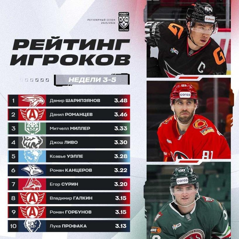 В рейтинге игроков КХЛ лидером стал Дамир Шарипзянов из омского хоккейного клуба «Авангард». Об этом сообщили в пресс-службе КХЛ. Первые три места в рейтинге за 3–5 недели сезона заняли Дамир Шарипзянов, Данил Романцев из «Автомобилиста» и Митчелл Миллер из «Ак Барса». Изображение: КХЛ Шарипзянов — второй бомбардир лиги среди защитников. У него 13 очков. На первом месте Максим Лажуа с 14 очками. Ранее портал Om1 Омск сообщал, что нападающий омского «Авангарда» Эндрю Потуральски стал одним из лучших бомбардиров Континентальной хоккейной лиги. Читайте также на портале Om1.ru Нападающий «Авангарда» Эндрю Потуральски вошёл в топ бомбардиров КХЛ