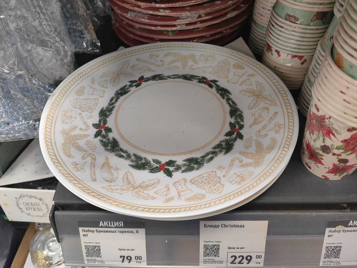 Полным ходом в Фикс Прайс идет приемка товара. Сразу же выставляют новинки. Посмотрите, какое нарядное блюдо нашла среди новогодних украшений. Большое, с белой, прочной основой из стекла, для праздничной сервировки неплохо. Хотелось бы несколько предметов этой коллекции посуды, хороши на вид. Знаете, и точно будут еще новинки, как подсказали продавцы, где-то в коробке еще посуда, квадратное блюдо точно видели, узор похожий. Елочки - это менажницы такие, были и год назад. Выставили. У меня такое ощущение, что 50/50 новогодних новинок, немало повторов, что было популярно прошлой зимой. В коробочке посеребренные шишки, это такие свечи. Все одинаковые. Рядом еще объемные елочки - это тоже свечи, каждая 7,5 см. Разные по цвету. Единственное, в глубине витрины стоят прямоугольные коробки, фигурки другие, не успела рассмотреть как следует, ценника к тамим тоже не было, зайду еще раз. А это не только елочная игрушка, шар металлический, внутри открытка с приятным пожеланием. Феечка на по