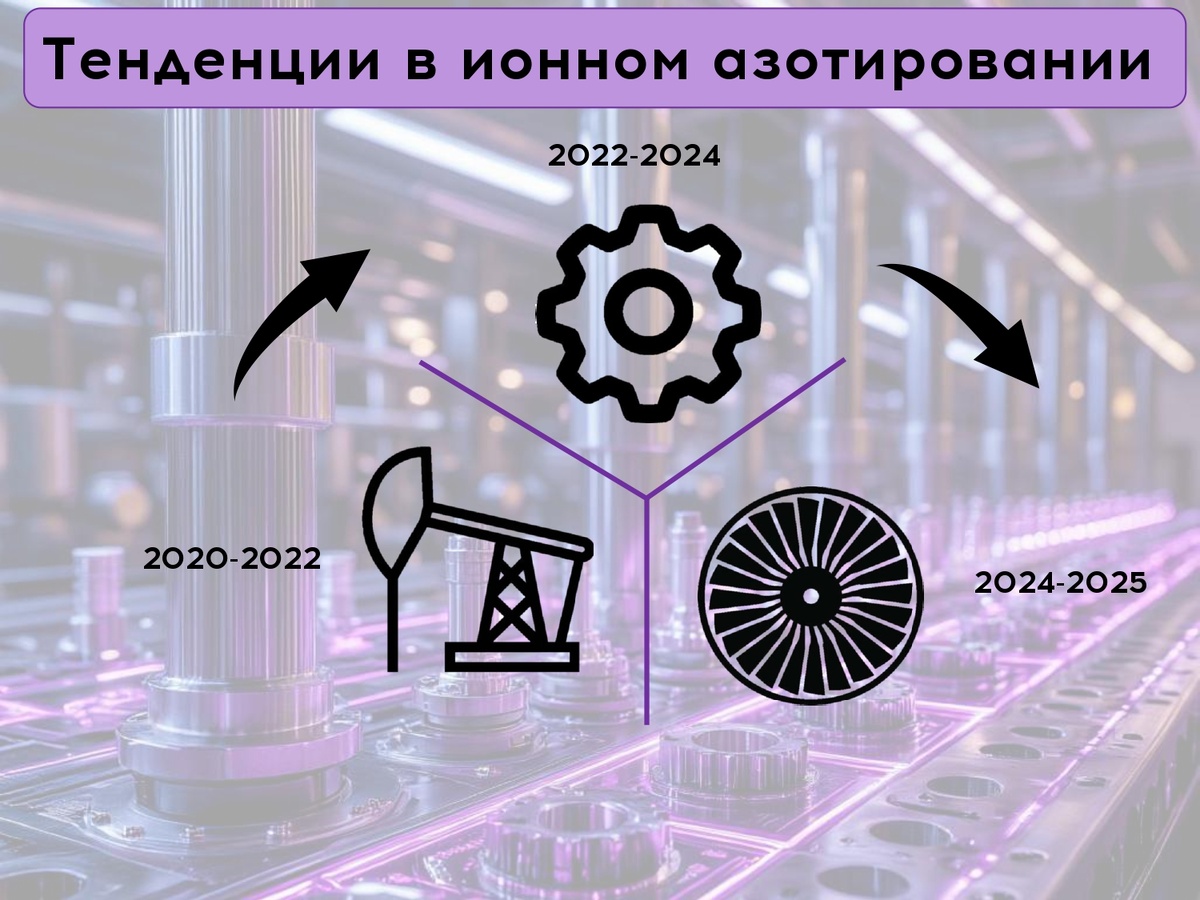 Технологии меняют векторы развития, отражая стратегические приоритеты страны. За последние годы чётко прослеживаются три ключевых этапа развития: 🛢🏭в 2020–2022: cпрос от нефтегазового сектора. Внимание уделялось упрочнению деталей оборудования: штоков, валов, муфт и соединительных элементов. Ионное азотирование успешно решает задачи по повышению износостойкости и коррозионной стойкости в агрессивных средах. 🚀⚙️2023–2024: фокус на прецизионные механизмы. Активно растёт спрос на мелкомодульные зубчатые передачи — для редукторов, приводов, систем точного позиционирования. Внимание уделяется сохранению геометрии деталей при достижении высокой твёрдости. Успешно обрабатываются стали 38Х2МЮА, 14Х17Н2, 12Х18Н10Т и др. с контролем слоя от 10 мкм. ✈️🏭С 2024 года начинается новый этап — работа с титановыми сплавами для авиационной и турбинной промышленности. Несмотря на историческую сложность азотирования титана, найдены эффективные технические решения. #тенденции