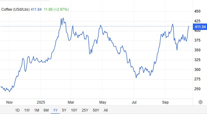 В общем, Бразильское сельскохозяйственное агентство Conab снизило свой прогноз производства арабики в 2025 году на 4,9% до 35,2 млн мешков. Кроме того, усугубили ситуацию 50% пошлины от США, вынудив американских покупателей расторгнуть часть контрактов и сократить поставки. Напомним, Бразилия обеспечивает примерно треть экспорта необжаренного кофе в США. Таким образом общий ценовой тренд остается во