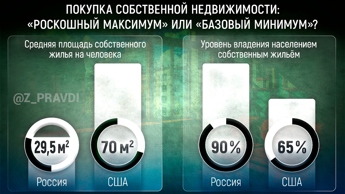 При этом, надо чётко понимать, чем население России отличается от западного, где жилье тоже дорогое и не сильно доступное. Мобильность населения в России и в тех-же США несопоставимы. Традиции аренды и потребность в «собственном» доме или квартире — тоже. Россияне хотят меньшую по размерам, но «свою» квартиру: у нас на человека приходится в среднем 29,5 «квадрата» против приблизительно 50 «квадратов» в Германии или 70 в США. При этом, «уровень владения жильём» в России (и Восточной Европе) традиционно высокий: 90+% в России против 65% в США.