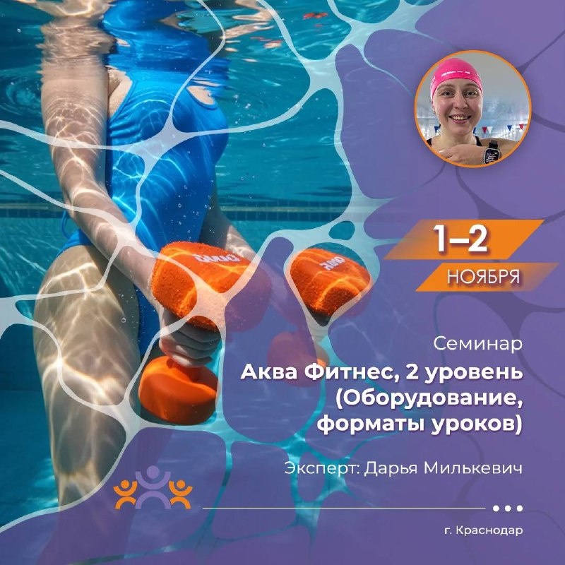 ПРИГЛАШАЕМ НА СЕМИНАР «АКВА С ОБОРУДОВАНИЕМ» 👍Приглашаем вас на двухдневный семинар «Аква Фитнес 2 , Оборудование и форматы уроков», специально разработанный для тех, кто уже прошел базовый курс по аква-фитнесу и готов углубить свои знания и навыки! Ваш эксперт: Дарья Милькевич Семинар проведет Дарья Милькевич, координатор водных программ и мастер-тренер фитнес-клуба "XFIT Солнечный" в Краснодаре. Дарья имеет более чем 10-летний опыт работы в аквафитнесе, является экспертом ФПФКК по аквафитнесу и была признана лучшим инструктором по аквафитнесу Краснодарского края в 2024 году. ⚡️Что вы получите на семинаре? — Освоение методик проведения различных типов тренировок: силовой, интервальной, круговой. — Практическое использование оборудования (гантели, нудлы, джоггеры, перчатки).Мы расскажем о каждой единице оборудования, её преимуществах и особенностях использования. — Составление готовых аква-программ с отработкой правильной техники упражнений с оборудованием. — Отработка теории и п