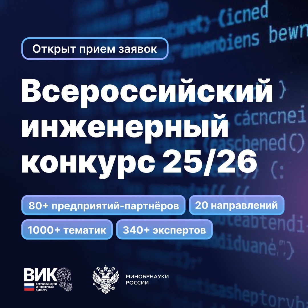 Твой диплом может изменить будущее. Всё зависит от тебя! Подай заявку на Всероссийский инженерный конкурс получи поддержку от предприятий-партнеров и преврати выпускную работу в реальный проект, способный изменить мир к лучшему. ВИК — это твой шанс выйти за рамки учебы и заявить о себе на самом высоком уровне: – направления на любой вкус: от IT, ядерной энергетики и космических технологий до медицины, агроинженерии и экономики – наставники из числа профессионалов индустрии – возможность представить свою ВКР экспертам и лидерам высокотехнологичных отраслей экономики на очной защите в Москве – эксклюзивные предложения по трудоустройству от партнёров конкурса – дипломы, сертификаты и ценные подарки от партнёров конкурса – дополнительные баллы при поступлении на следующий уровень образования И самое ценное — сообщество молодых инженеров и исследователей, готовых менять будущее вместе с тобой. В новом сезоне конкурса открыт научно-исследовательский трек, позволяющий магистрам, специали