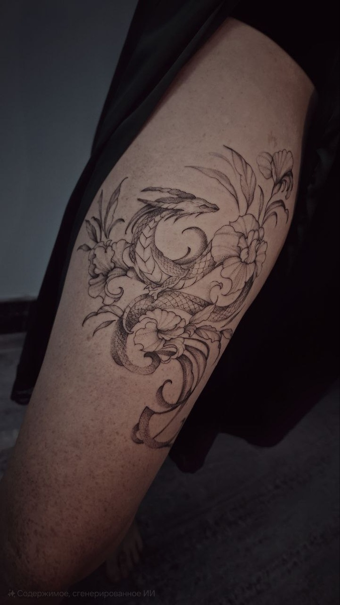 Этот Дракон — дыхание силы, воплощённой в женской грации. В его изгибах живёт красота, нежность и внутренняя мощь. Он существует - уверенно, свободно и по своим законам. В теле — живое течение энергии. Каждая чешуйка, каждый штрих — словно дыхание, пульс, движение жизни. Через цветы в рисунке раскрывается женская суть: не разрушать, а творить, не воевать, а преобразовывать. 💬 “Мы похожи. В нём изображена мощь, сила, красота и нежность. Словно это я, но в другом измерении…” — написала Диана после сеанса. И это самая точная формулировка сути этой татуировки. После таких тату пространство действительно начинает меняться: человек возвращается в тело, в силу, в свой Дух. Дракон — символ владычества над своей энергией. Он поднимает, защищает и открывает внутренний источник власти — не над другими, а над собой. Такой рисунок выбирают женщины, которые чувствуют, что внутри них спит мощная, красивая сила. Это возвращение к себе. 🐉✨ Написать мастеру http://t.me/alexandradulchy Тату.Смысл